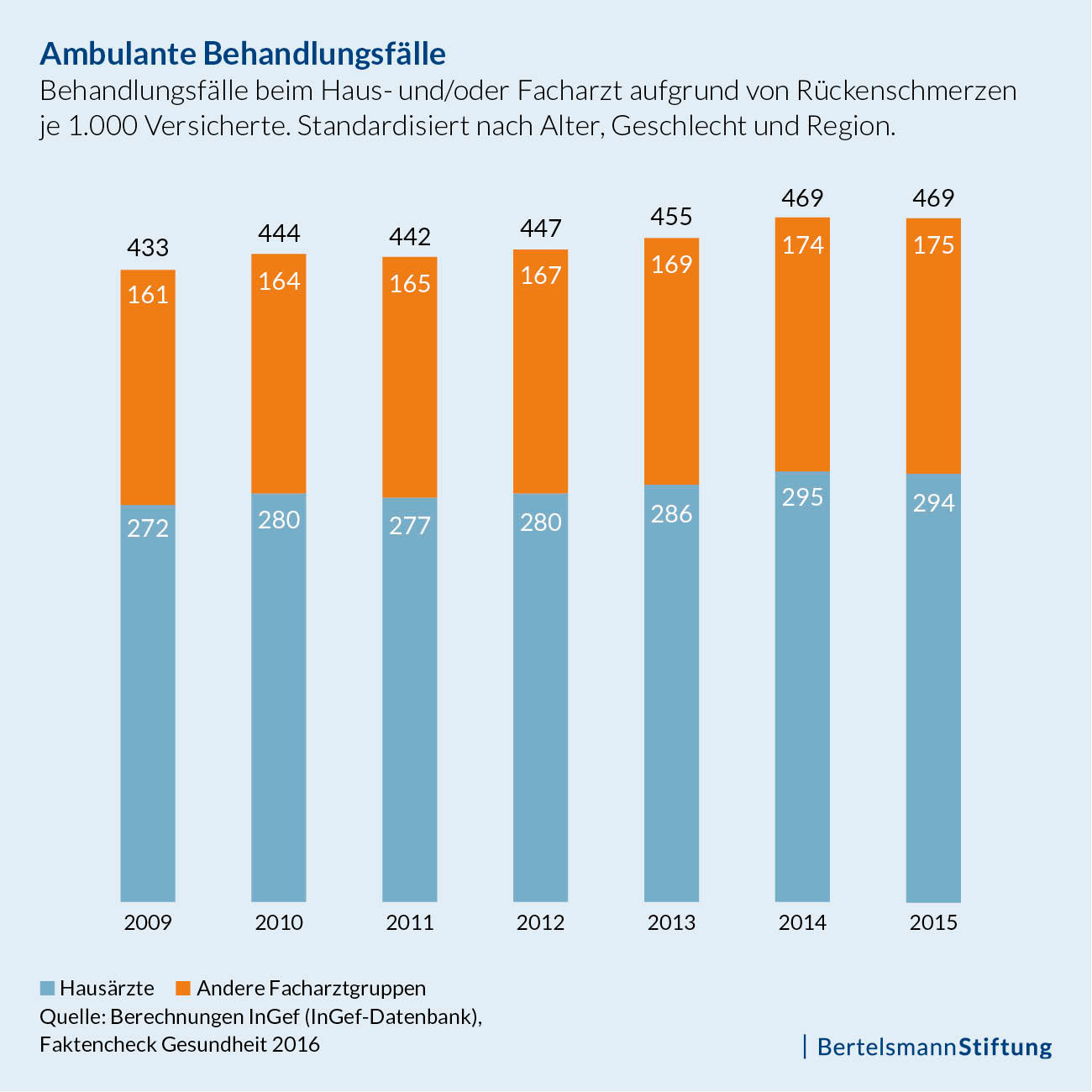 20 Prozent aller Versicherten waren 2015 ein oder mehrere Male wegen Rückenschmerzen beim Arzt. Die Analysen ergaben gerundet 469 Behandlungsfälle (Arztbesuche in verschiedenen Quartalen oder bei verschiedenen Ärzten) je 1.000 Versicherte, davon 294 beim Hausarzt und 175 bei Ärzten anderer Fachgruppen. Das sind hochgerechnet 38 Millionen Behandlungsfälle.