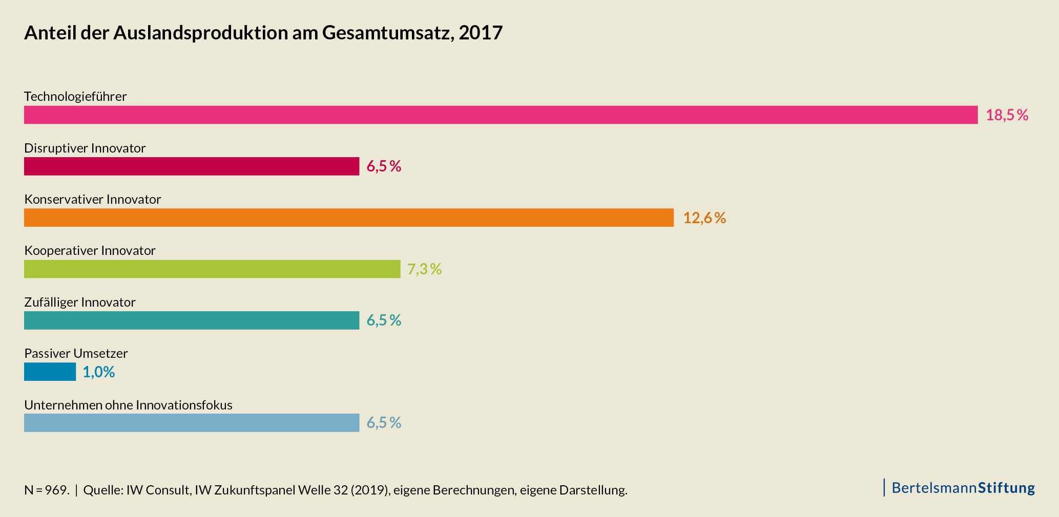 Anteil der Auslandsproduktion am Gesamtumsatz, 2017. Grafik aus der Studie "Innovative Milieus. Die Innovationsfähigkeit deutscher Unternehmen", veröffentlicht im Oktober 2019.