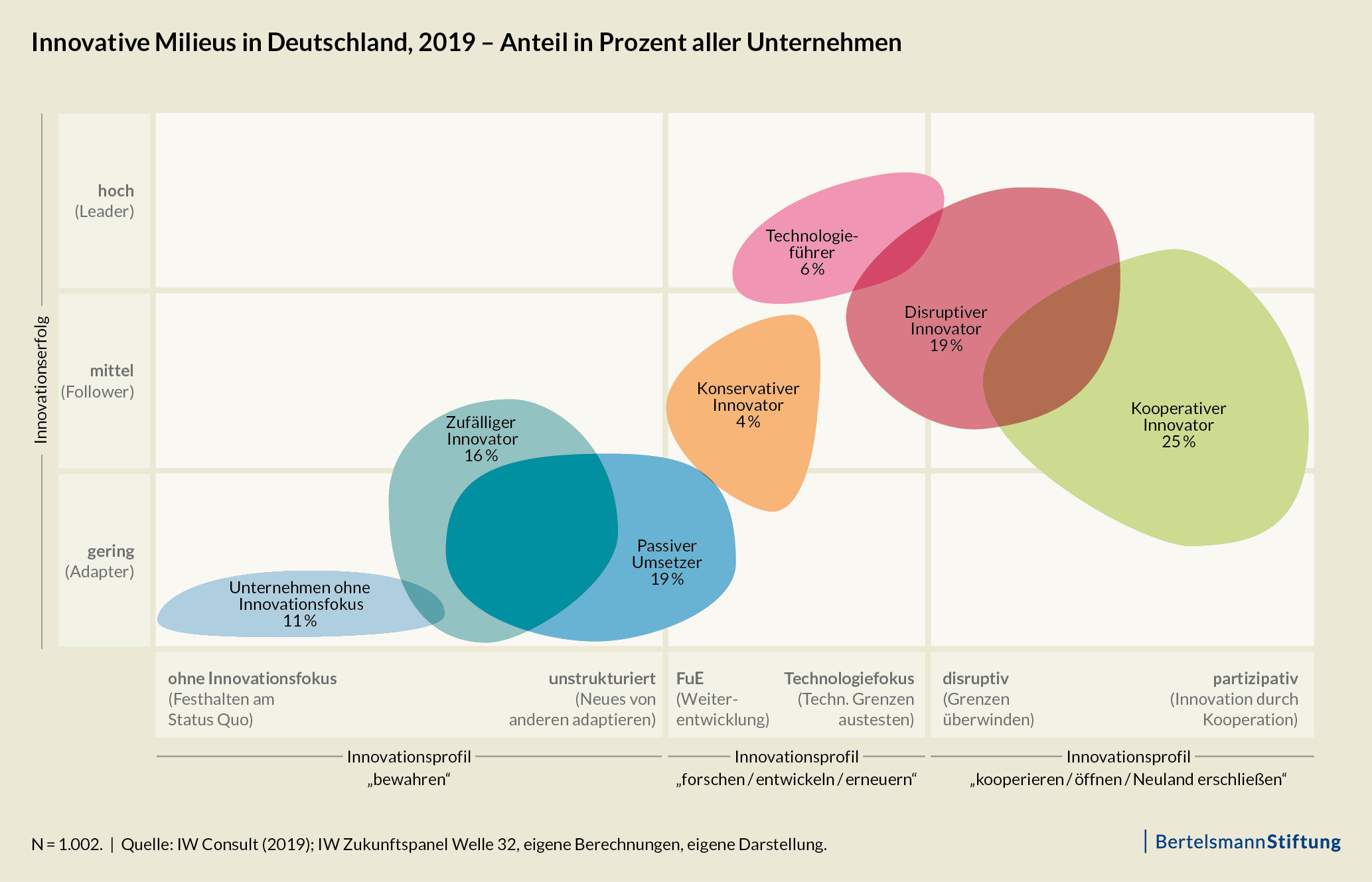 Innovative Milieus in Deutschland, 2019 - Anteil in Prozent aller Unternehmen. Grafik aus der Studie "Innovative Milieus. Die Innovationsfähigkeit deutscher Unternehmen", veröffentlicht im Oktober 2019.